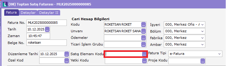 Faturada sipariş sorumlusunun sağ üst kısımda görünmesi için resimdeki gösterilen alana aşağıdaki kodu ekleyelim.