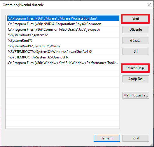 Buraya çalıştırmak istenilen javanın bin klasörünün yolu gösterilir (örn: C:\Program Files (x86)\Java\jre1.8.0_221\bin) ve yukarı taşı butonu ile en yukarı taşınır.