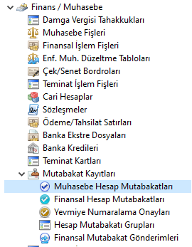 Orkestrada tanımlanacak Muhasebe Mutabakatı için Finans/Muhasebe > Mutabakat Kayıtları > Muhasebe Hesap Mutabakatlarına tıklanır.