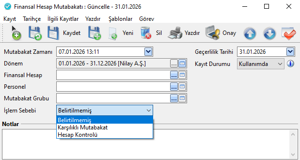 İşlem Sebebi: Karşılıklı Mutabakat seçildiğinde, karşı firma ile seçilen Finansal Hesap için ortak bir mutabakat kaydı oluşturulur.