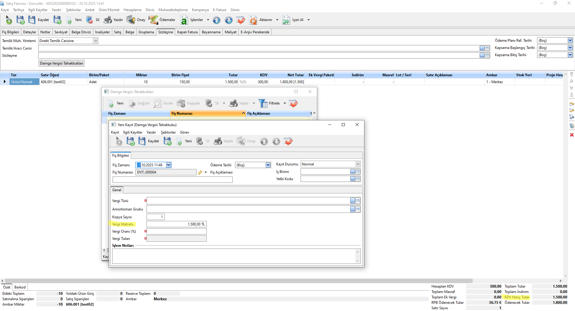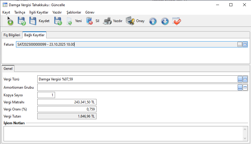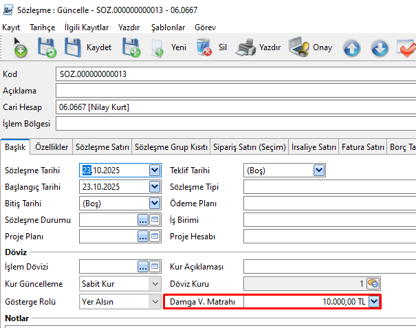Satış Faturası > Sözleşme sekmesi üzerinden ilgili faturaya bağlı Damga Vergisi Tahakkuku oluşturulabilir.