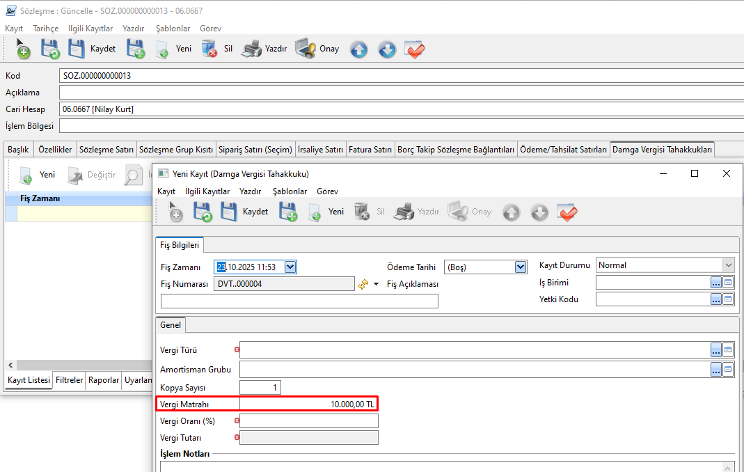 Sözleşmenin "Başlık" sekmesinde yer alan "Damga V. Matrahı" alanına girilen tutar, Tahakkuk Fişindeki Vergi Matrahı alanına otomatik olarak aktarılır.