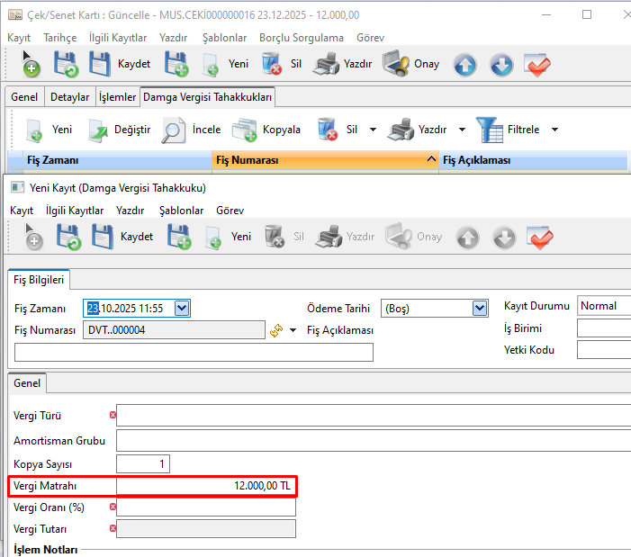 Çek/Senet Tutarı alanına girilen tutar Damga Vergisi Kartı içerisindeki Vergi Matrahı alanına sistem tarafından otomatik gelmektedir.