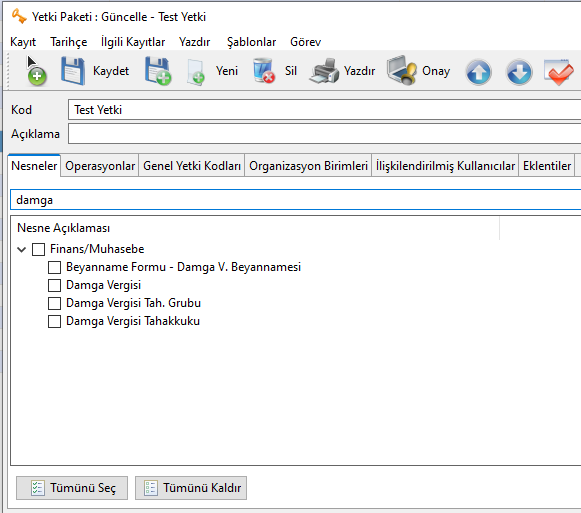 Damga Vergisi Tahakkuk Fişi ve Damga Vergisi Beyannamesi oluşturma işlemlerini yapabilmek için kullanıcının ilgili yetkilere sahip olması gerekir.