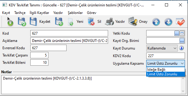 Limit üstü kontrolü, Tevkifat kartı bazında yapılır ve zorunluluk derecesi karttan belirlenir. Bu, kullanıcının tevkifat yapmayı unutmasını engellemeyi amaçlar.