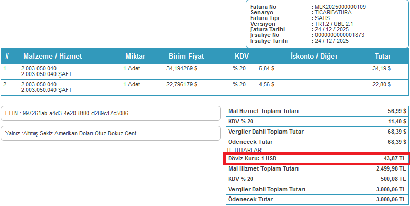 Faturada girilen döviz kurunun fatura alt tutarlar alanında görünmesi için aşağıdaki xslt kod satırını fatura tasrımınızda resimde gösterilen alana yapıştırmalısınız.
