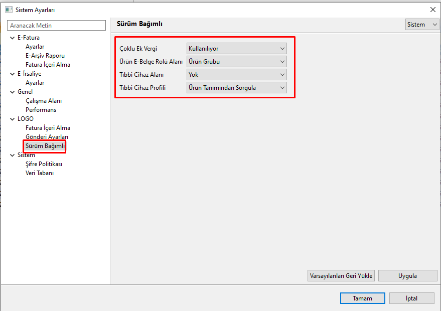 LOGO / Sürüm Bağımlı seçeneği altında yer alan ayarlar aşağıdaki şekilde seçili olmalıdır: