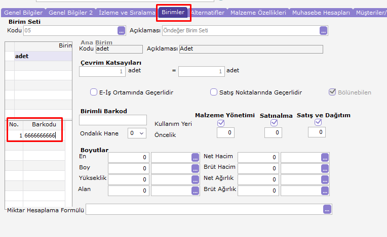 Logo’da GTIN UNO kodu için ayrı bir alan bulunmadığı durumlarda, GTIN UNO kodu Malzeme Kartı içerisindeki Birimler sekmesinde yer alan Barkod alanına yazılmalıdır.