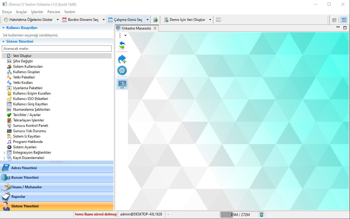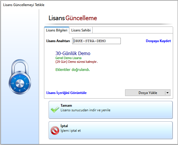 NOT!: Demo lisans süresi 30 gündür. Süre sona erdiğinde ekranda “Demo Lisans süresi dolmuştur.” uyarısı görüntülenecektir. Bu durumda lisansın yenilenmesi gerekmektedir.